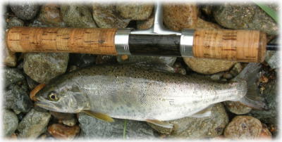 投入すると水中がキラッとひかり、竿に重みがグッとのしかかる20cmのやまめでした。